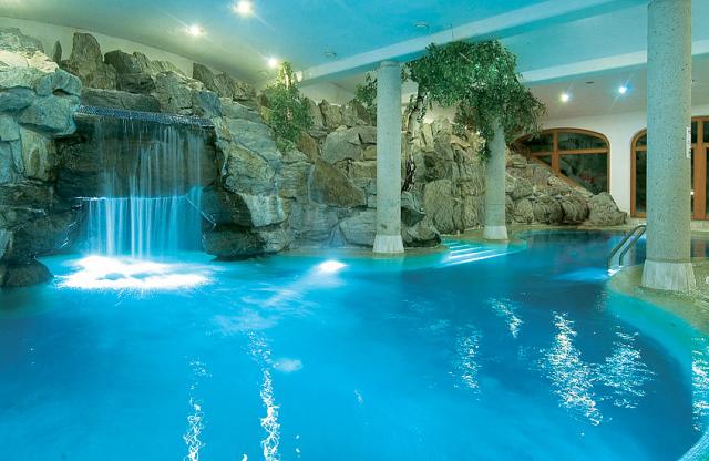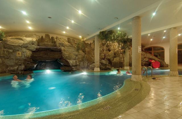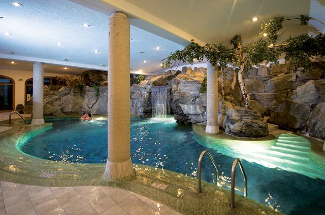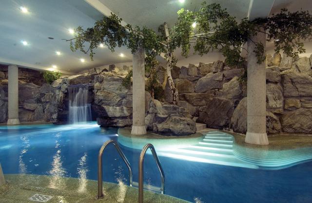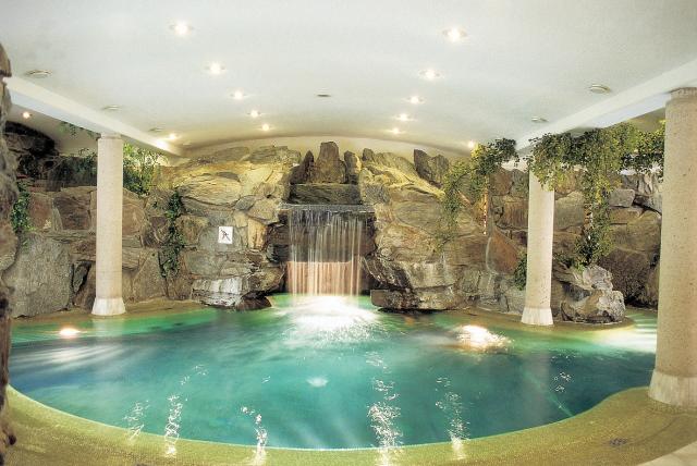 | bazén s umělým vodopádem a skluzavkou, finská sauna, horizontální