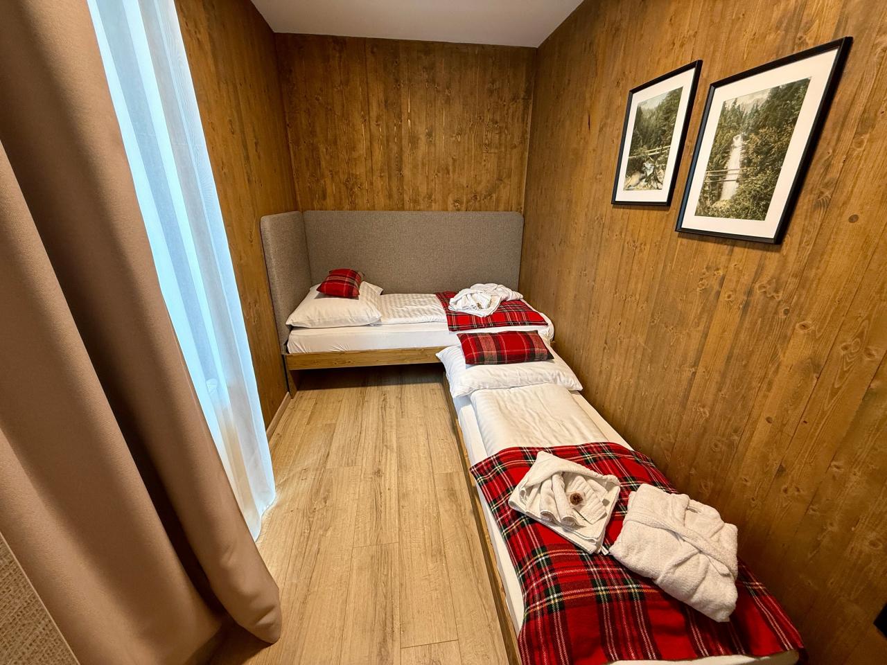 oddělenými lůžky, obývací část s rozkládací pohovkou, TV, kuchyňský
