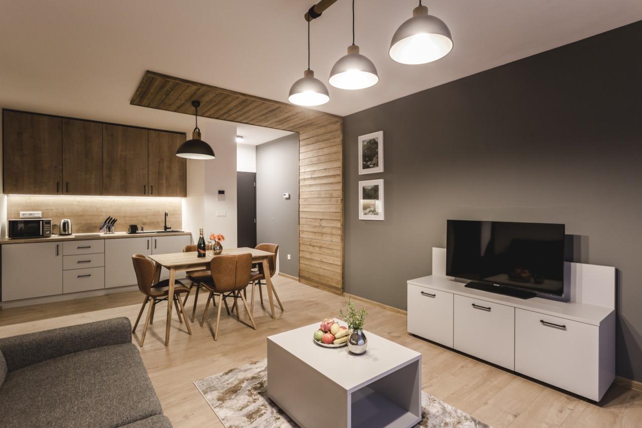 s rozkládací pohovkou, TV, kuchyňský kout